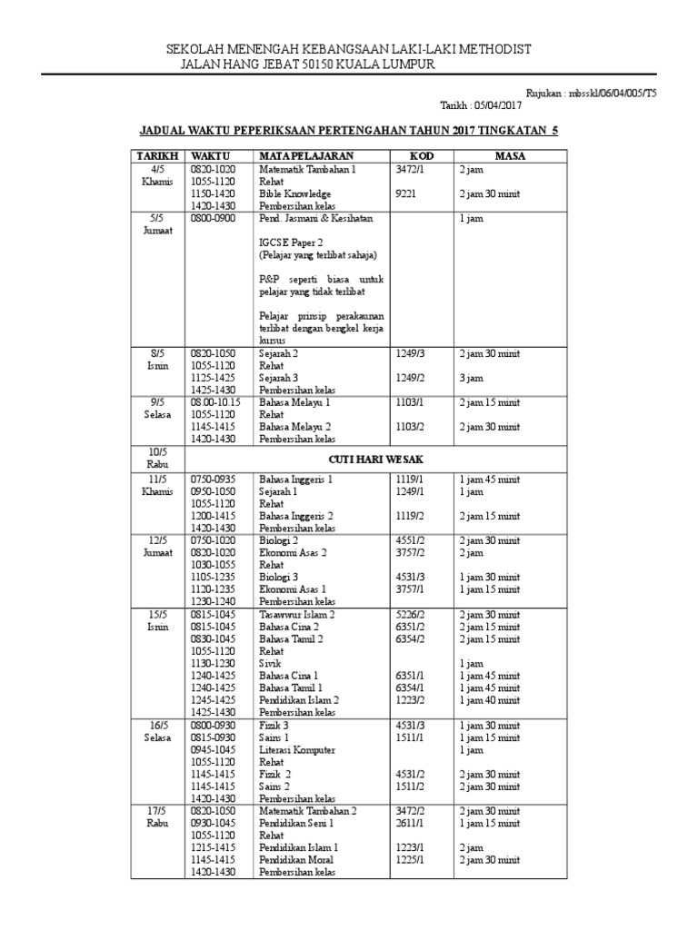 Jadual Peperiksaan Pertengahan Tahun Tingkatan 5 Pdf
